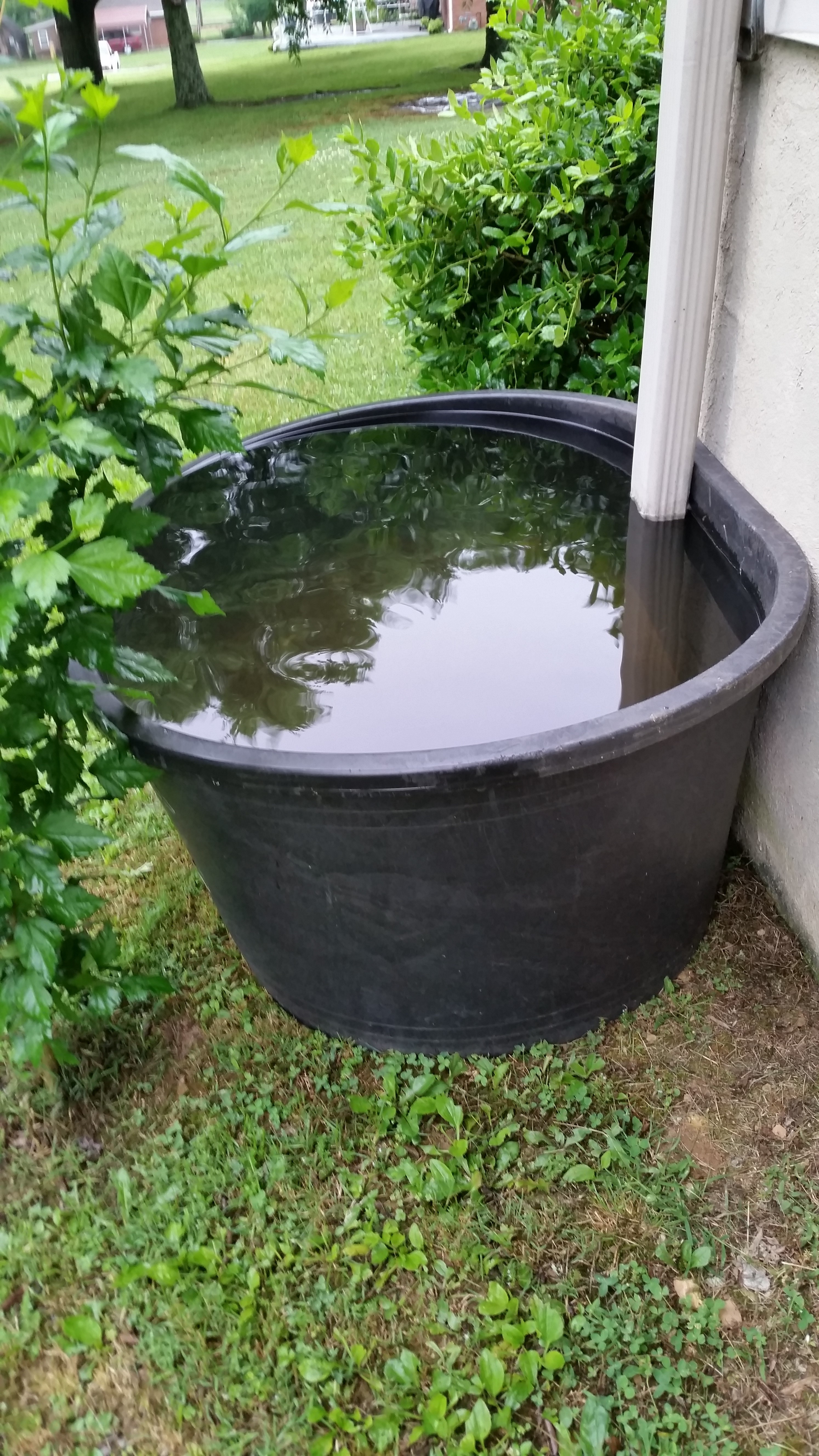 When it began to rain, Tom had a brilliant idea (he thought :-)) of saving on the water bill due to May’s barren days. So Saturday we pulled a 100 gallon tub (a flea market find) under a gutter to catch the precious liquid. The idea was that I would water newly transplanted trees, bushes and flowers with that–use the water quickly (the ground is unusually parched, right?) and then it would fill again with the next small shower.