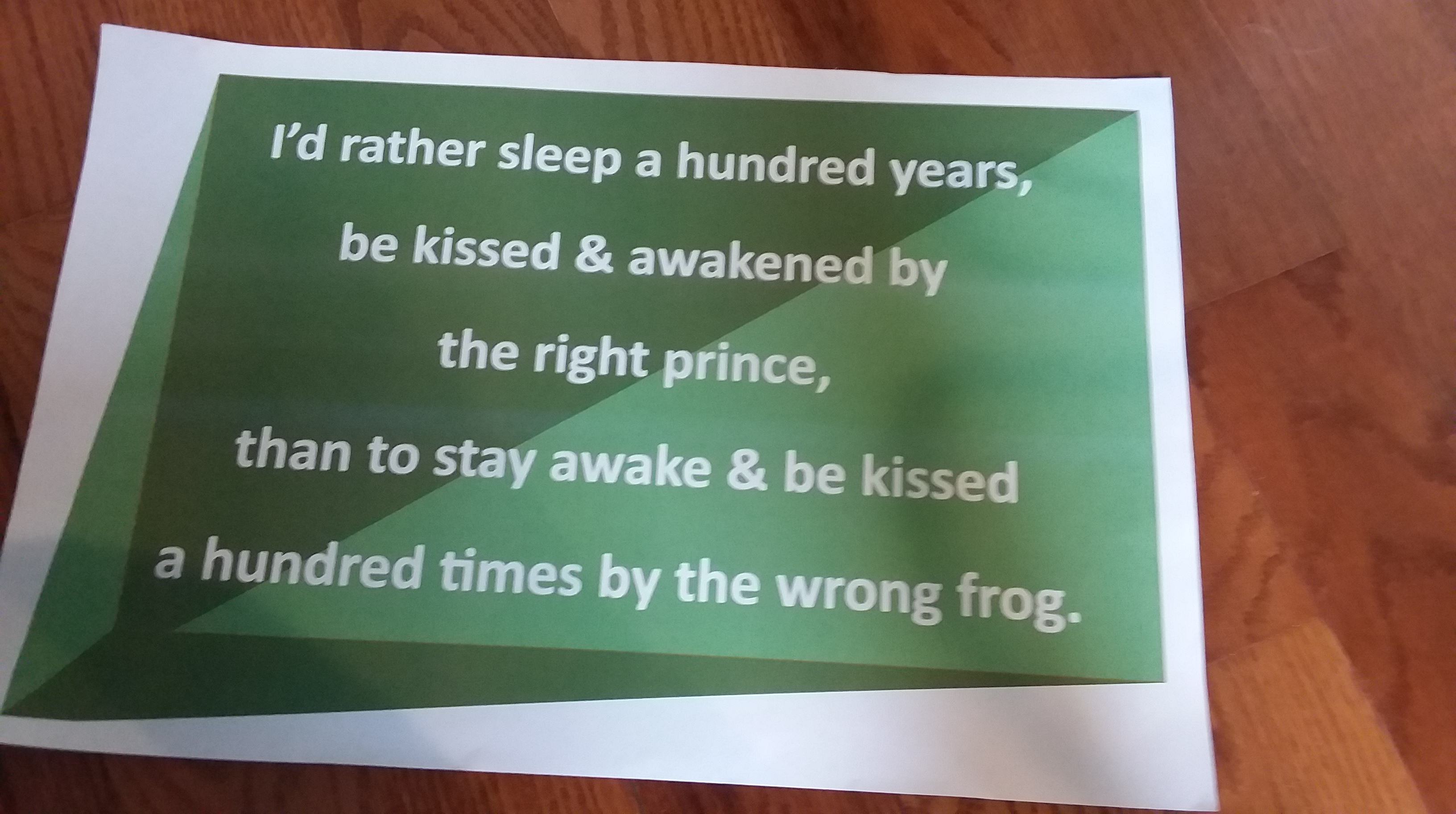 > oct17 posted: “I have always been gullible… … as the second oldest of nine > children, I imagined myself as Cinderella when piles of laundry covered the > floor on Monday, and I would iron for days. I spent many hours dreaming of > kissing a frog… he would turn into a prince” >