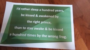 … as the second oldest of nine children, I imagined myself as Cinderella when piles of laundry covered the floor on Monday, and I would iron for days. I spent many hours dreaming of kissing a frog… he would turn into a prince and take me away on his horse. I half-way expected to find a little green frog hiding in a pile of dirty jeans. (The Frog Prince, a German fairy tale published in Grimm’s Fairy Tales in 1812)