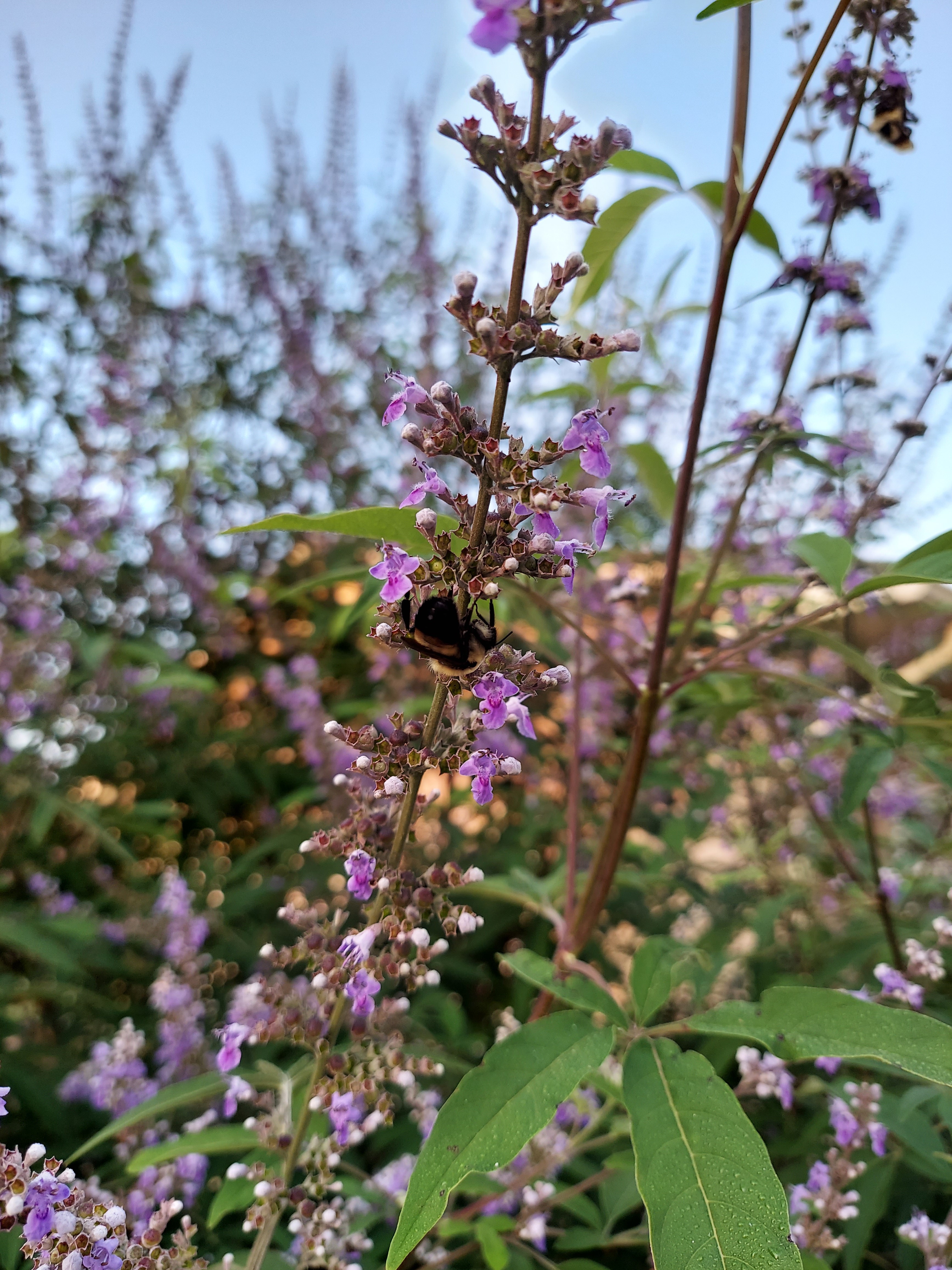 I have a new understanding of holding on for dear life. One early morning I noticed several bumblebees asleep in the flower clusters of my Chaste (Vitex) tree. I shook the branches; no movement. They were clinging… stuck like glue.