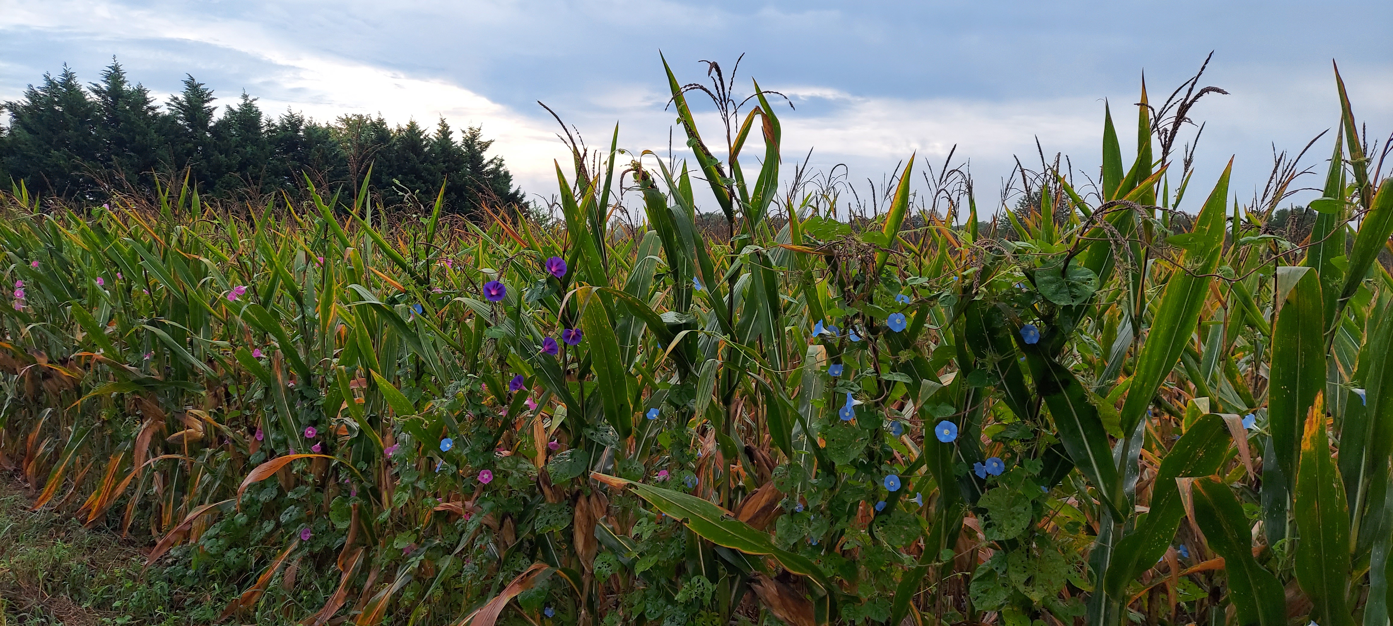After hearing a whisper to focus, I saw the morning glorys… those wild flowers that grow along country highways… you only see them in the morning. The mature corn stalks were ribbonned in blues, pinks and purples. How could I have missed beauty and focused on the trash?