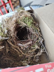 The basic need of a marriage is shelter; we call it “home”, providing similar features of a well designed bird nest. I would add acceptance and intimacy are needed in our human homes, though I suspect it must get quite intimate in this cozy nest , erected this week in a cardboard box of trash bags. This is my favorite kind of “home”… look closely and you can feel the softness, the warmth, the kindness, the care gone into the building of this “home”.