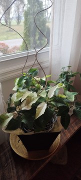 I admit I do talk to my plants, and often touch them as I walk past. Two Christmas poinsettias (one pictured below) continue to show off beautifully, and they’ve lived in this house for four months.